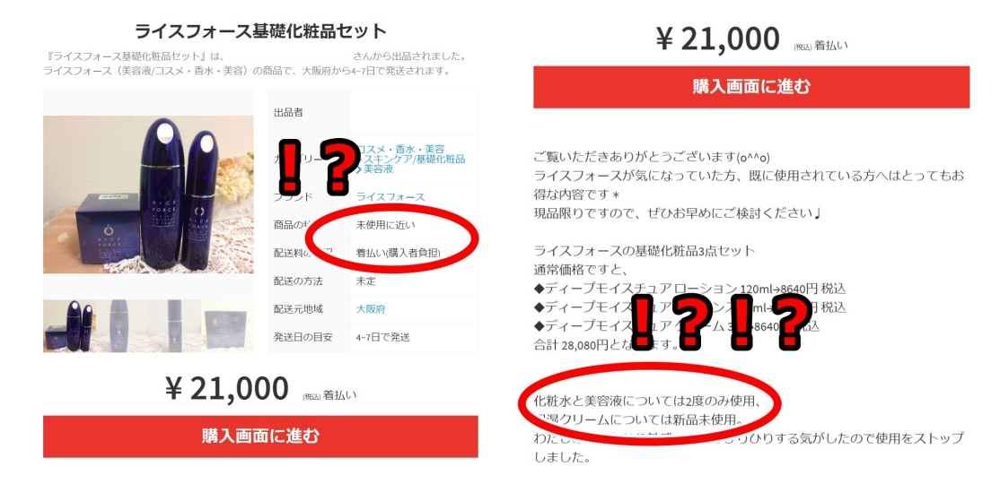 つまりamazonで売っているライスフォースの化粧水は、どこかが転売したり謎の経路で入手した可能性があるということです。