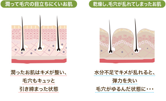 たるみの原因も毛穴開きと似ています。お肌が乾燥すると、ハリや弾力がなくなりキメも乱れます。そうするとお肌がたるみ、そのまま毛穴も開いてしまうんですね。