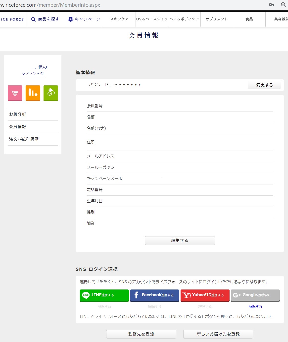 ライスフォースの会員の退会手続きから説明します。マイページの会員情報ページを見てみると…