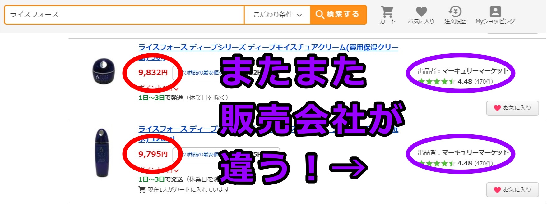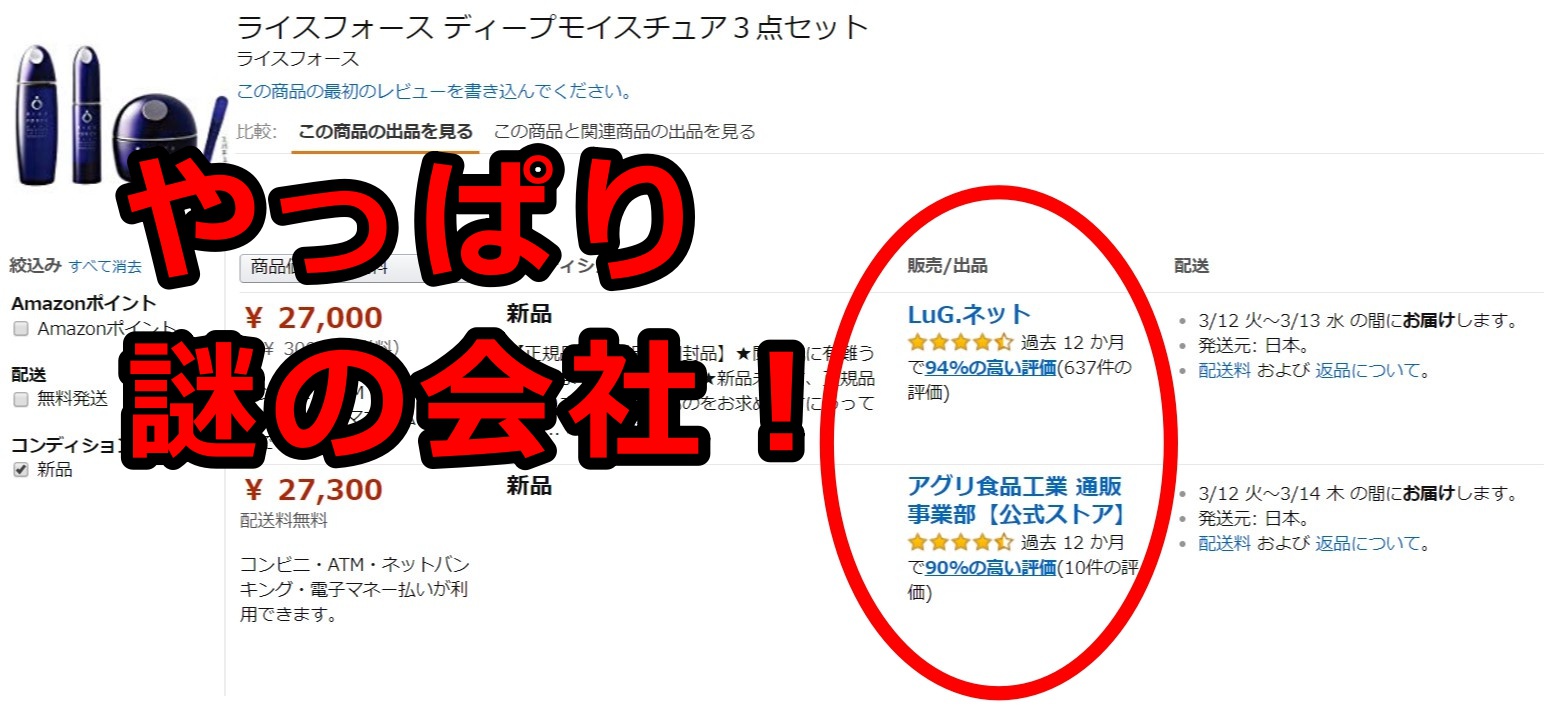 しかし、amazonで販売されているライスフォースの化粧水の販売/出品元は、全く別の知らない会社となっていました。