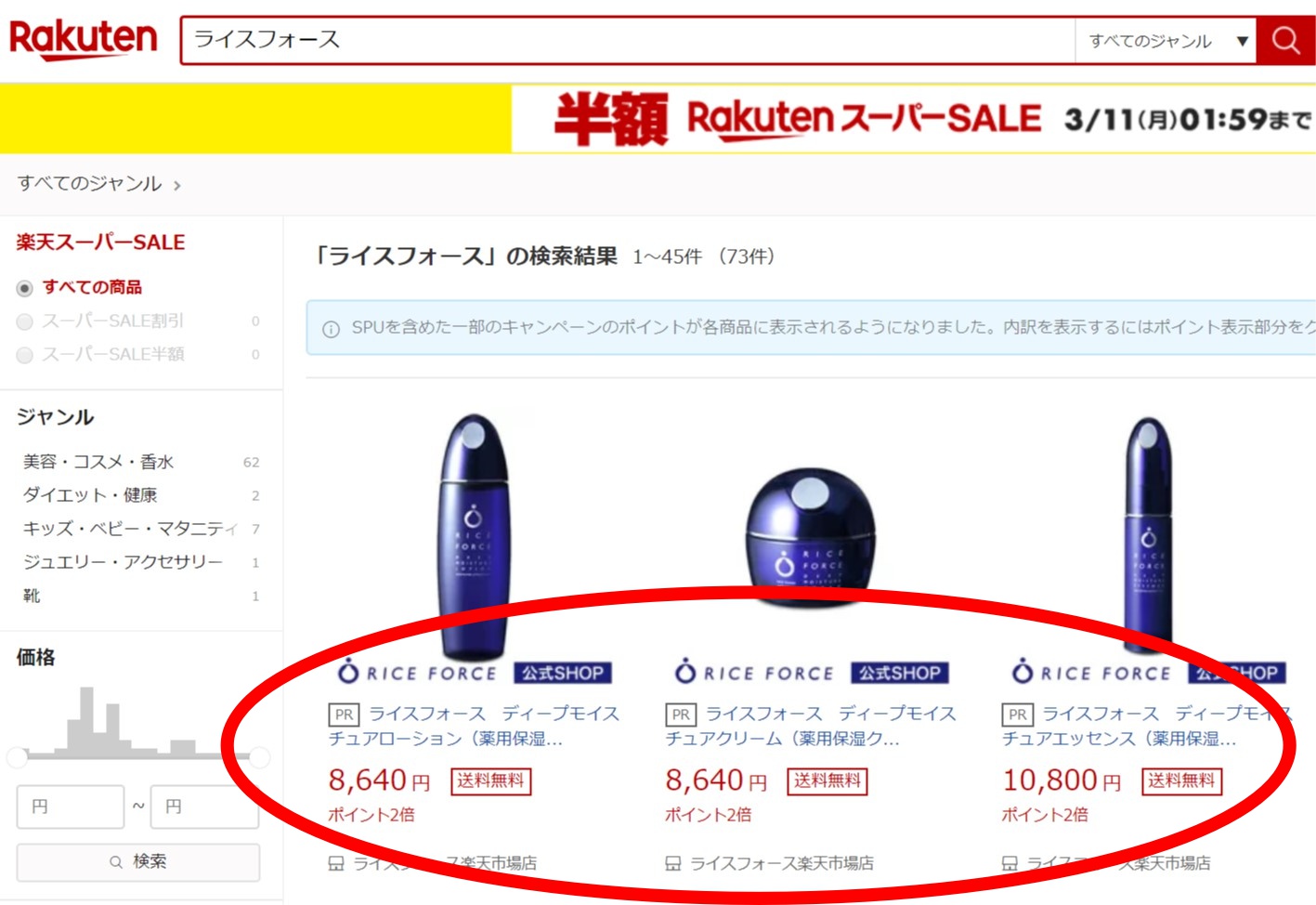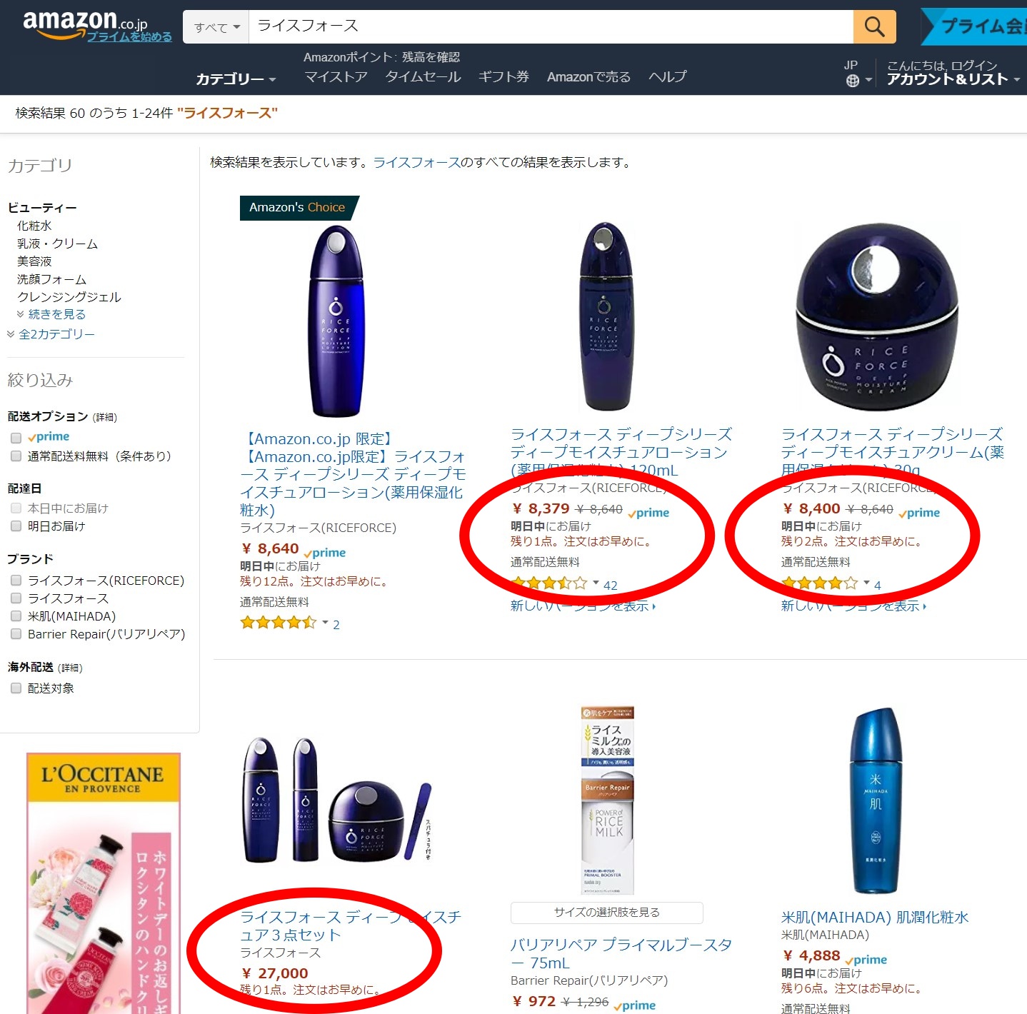 【Amazon.co.jp 限定】と書いてある化粧水がありますが、これはライスフォース公式がamazonで販売しているものになります。だから定価のままなんですね。