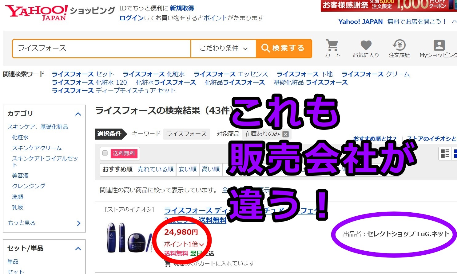 最後にヤフーショッピングでもライスフォースが販売されているのかを調べました。
