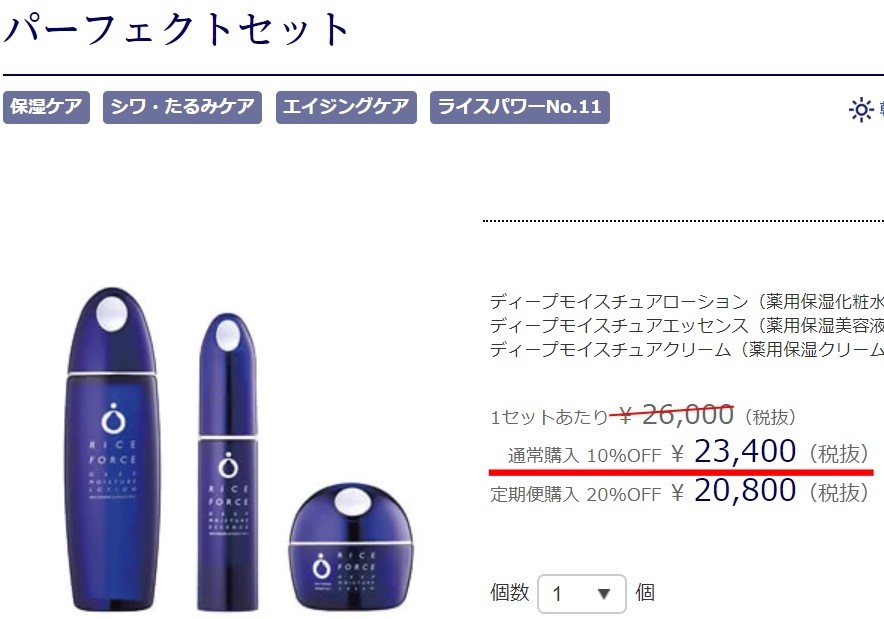 今回値段を比較するライスフォースの化粧品は、3つのディープモイスチュアシリーズと、その3つがセットになったパーフェクトセットです。それぞれの定価はこちらになります。