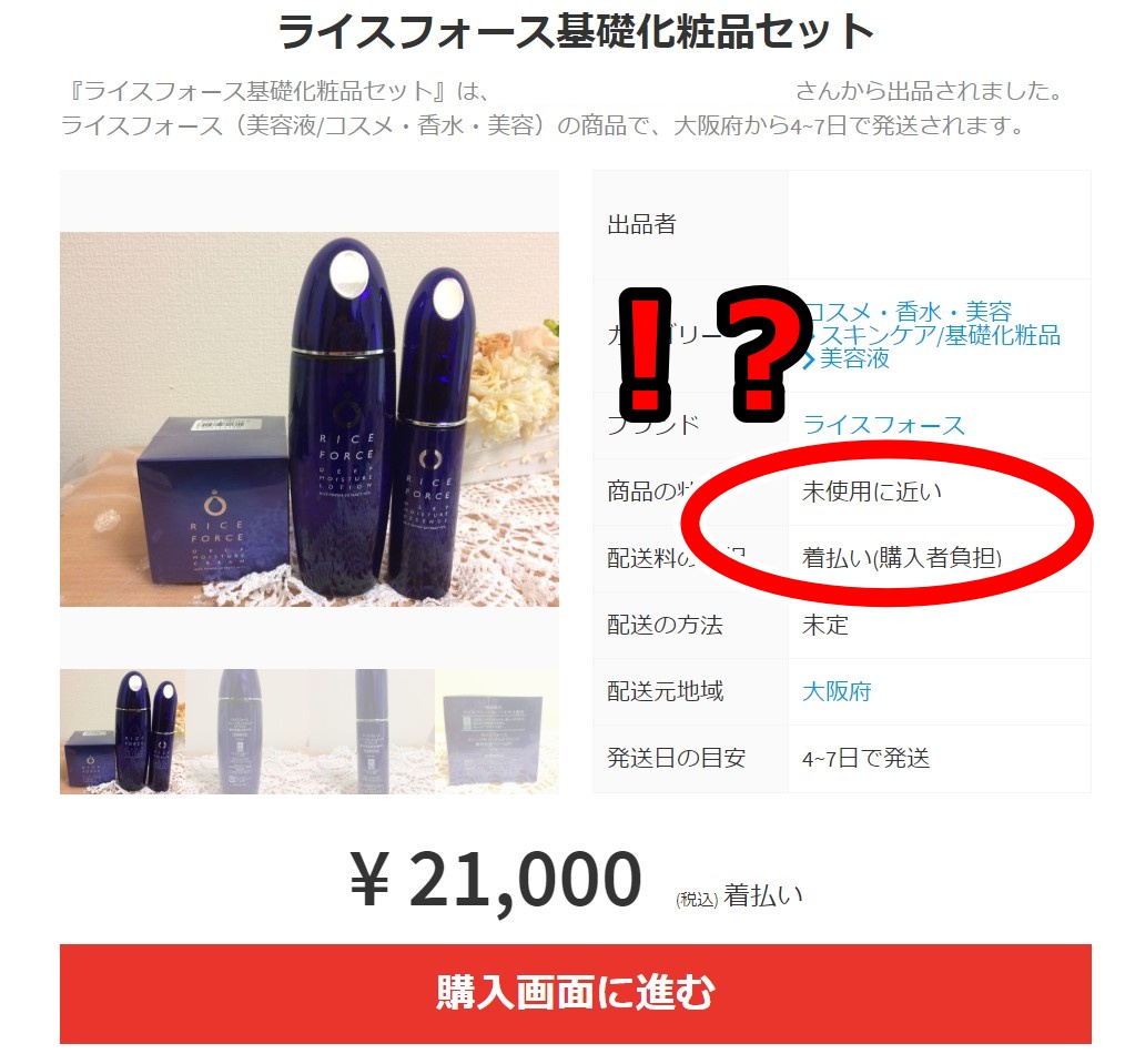 そんな経験をしたあなたは、メルカリやヤフオクやラクマといった、公式ではない会社や個人が保管・出品するライスフォースの商品を買うべきではないと思います!何かトラブルがあっても、「自己責任なので」とそのサイトから言われてしまいますよ?