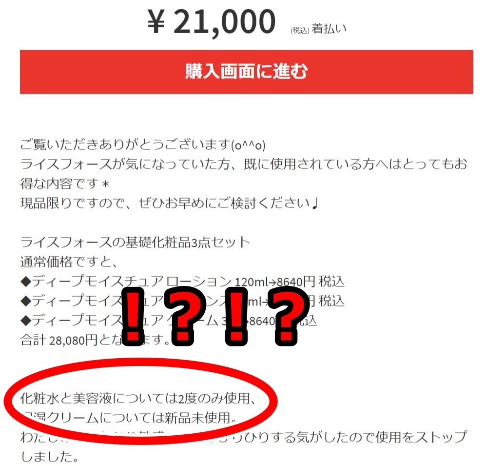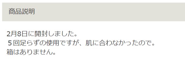 さらに詳しい商品説明を見ると。『5回足らずの使用ですが』と書いてありました! 5回ですよ、5回! 会ったこともない全く知らない誰かが5回も使った美容液、使えますか?私は絶対に無理です(笑)想像しただけでちょっと気分が悪くなりました…
