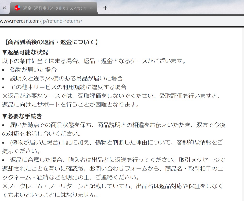 さらに、もしも商品が届いて「やっぱり返品したい」と思っても、取引後の返品・返金は基本的にはできません。そのためには出品者の了承を得なくてはならず、出品者が認めない場合はかなり難しくなります。このことはメルカリの公式HPにも明記してあります。