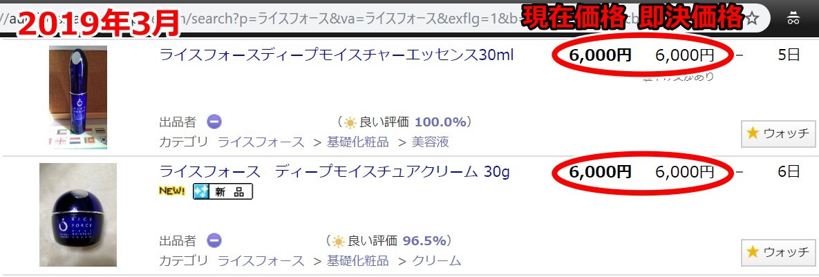 ライスフォースで調べたところ、値段が定価よりも安い美容液とクリームを見つけました。それぞれ即決価格が6,000円と書いてありますね。