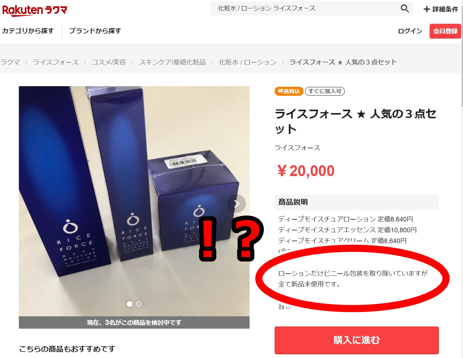 『ローション(化粧水)だけビニール包装を取り除いていますが全て新品未使用です』と書いてあります。「ビニールだけ取り除いたけど新品未使用だから安心してね!」と言っているように聞こえますね。