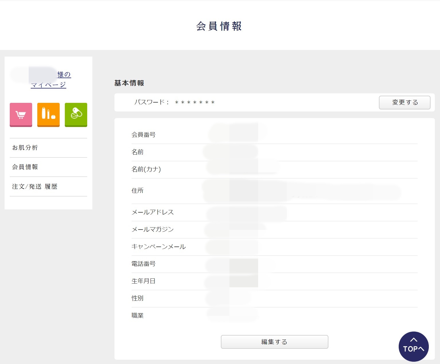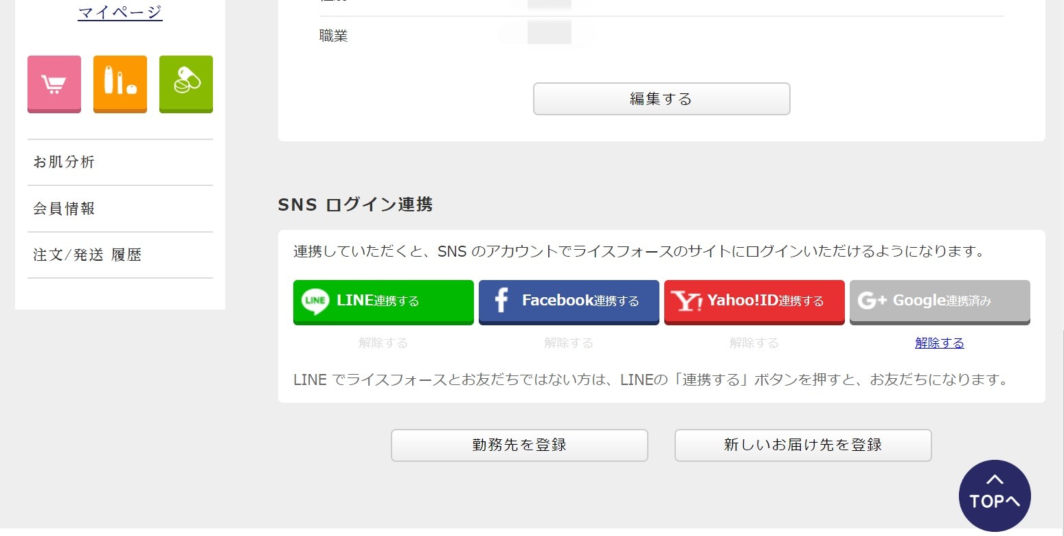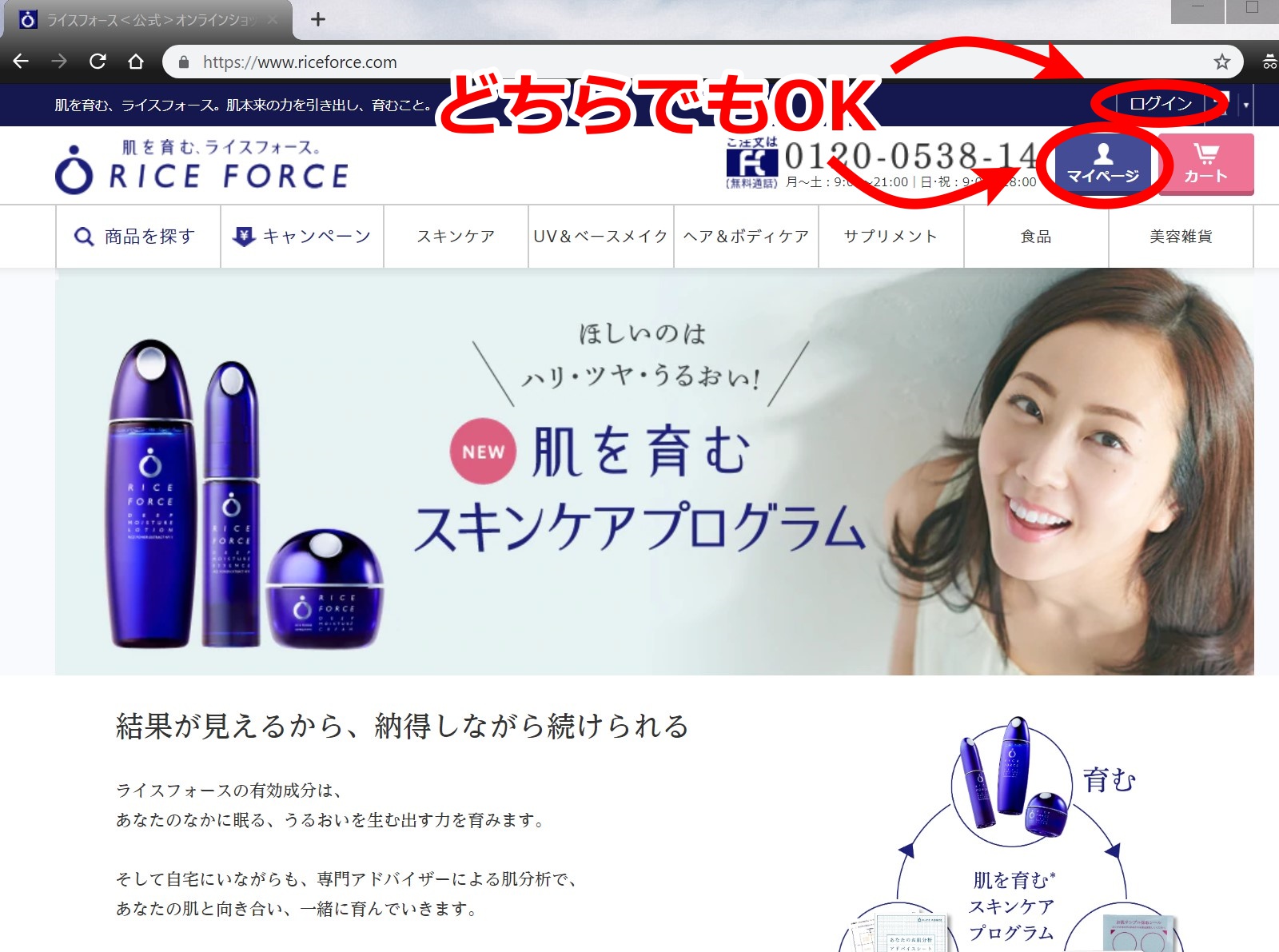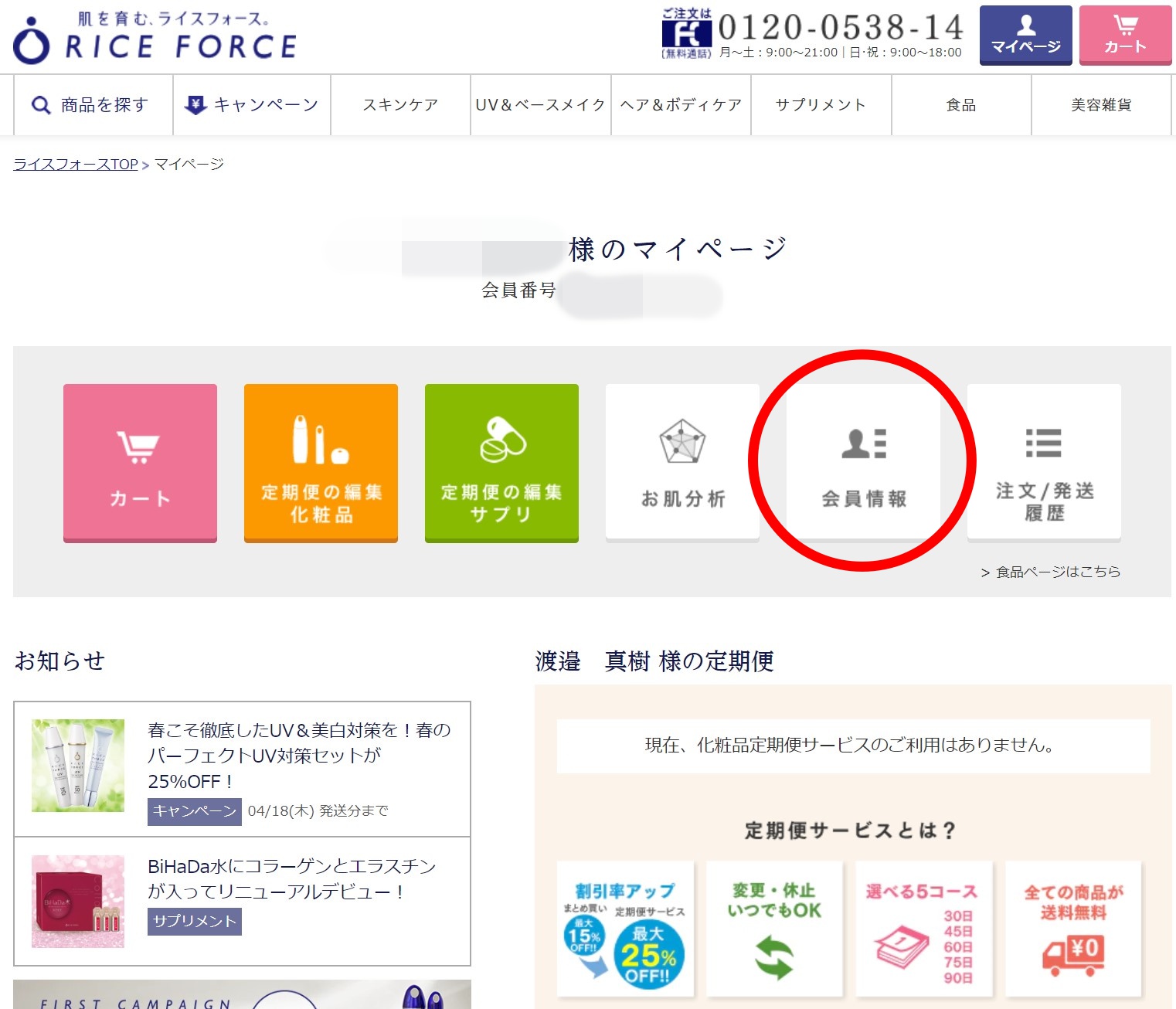 ライスフォースのマイページでは注文履歴や肌分析結果の確認、定期便の解約・変更ができます。今まで注文したときと別のIDやメールアドレスでログインしてしまうと、履歴や情報が残らないのでご注意を。