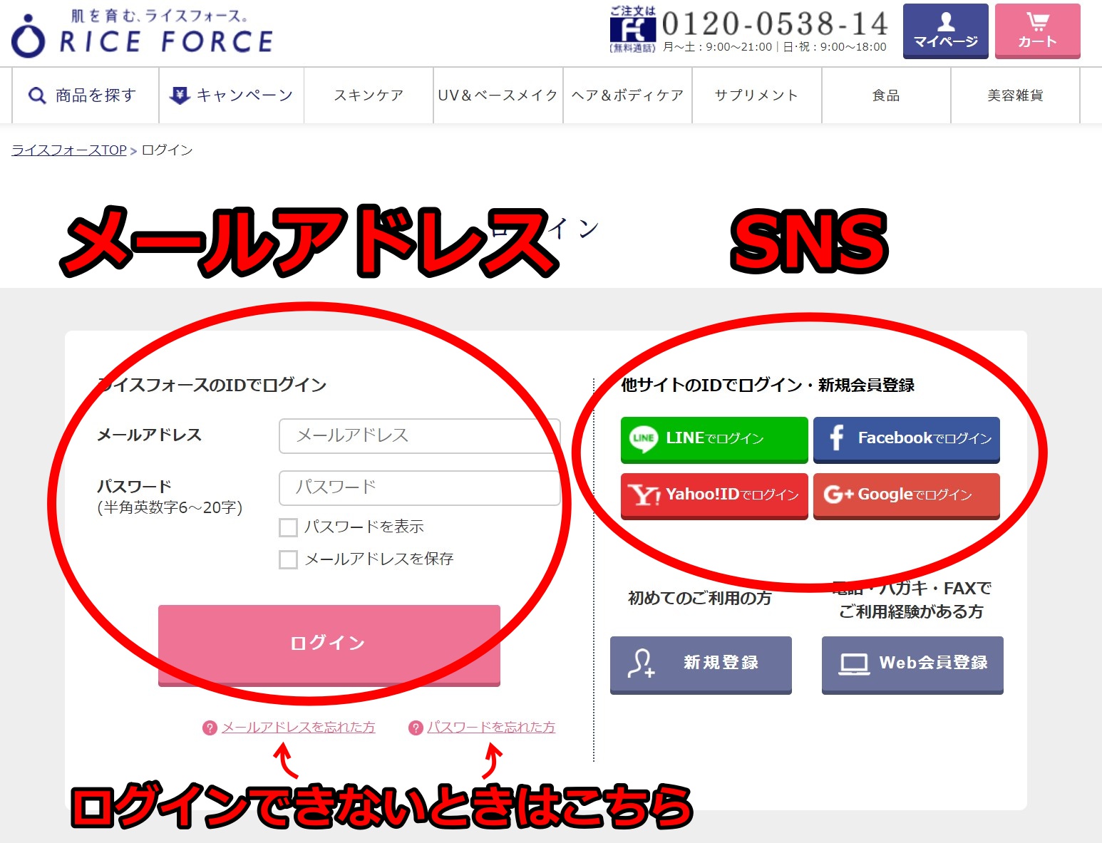 どちらでもログインできますが、これまでにライスフォース公式サイトで注文したことがあるなら、前回注文したときと同じ方法でのログインをおすすめします。