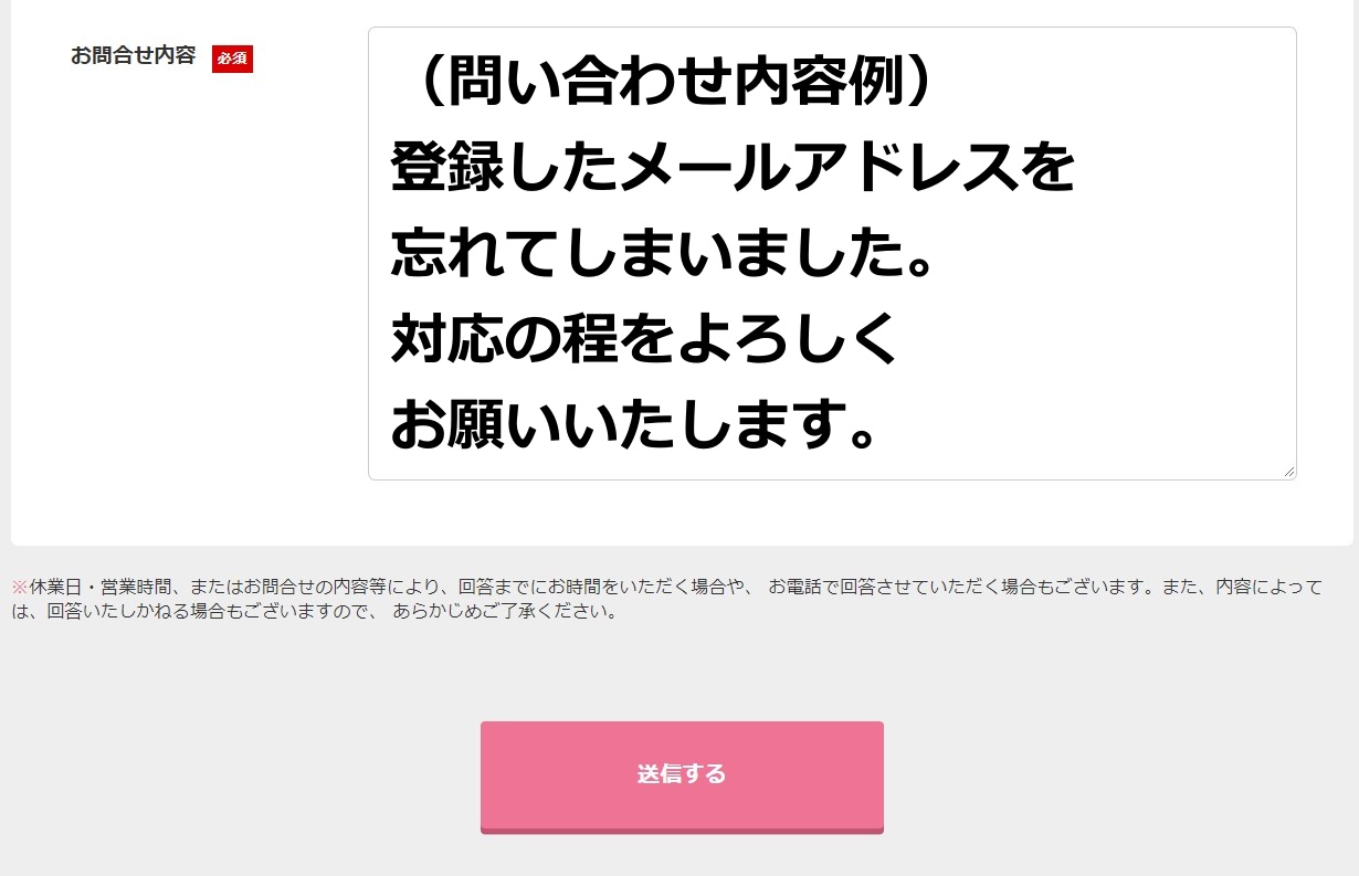 各種情報を記入したら、一番下の【お問い合わせ内容】に、『登録したメールアドレスを忘れた』ということを書いて【送信する】ボタンを押しましょう。