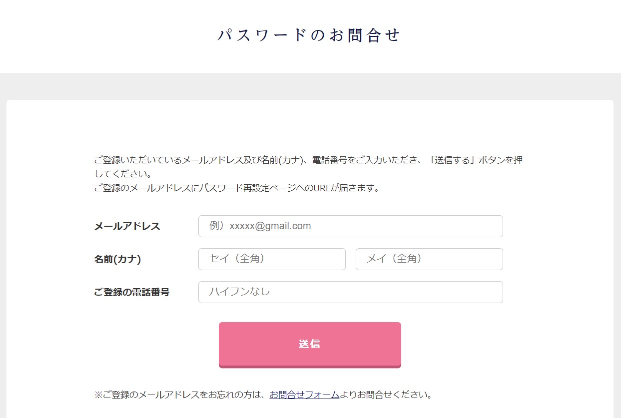 このような画面に移るので、メールアドレス、名前、電話番号を記入し【送信】ボタンを押してください。登録しているメールアドレスにパスワード再設定用のURLが送信されます。