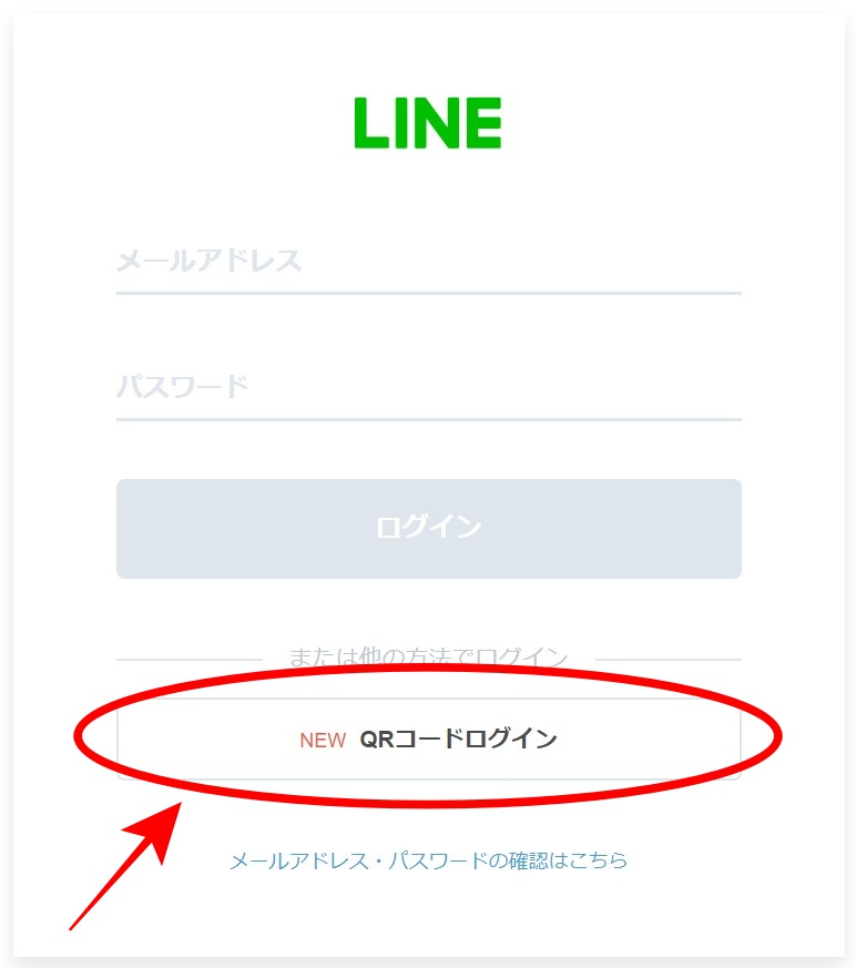 LINEではメールアドレスとパスワード以外にもログイン方法があります。ログインボタンの下にある【QRコードログイン】と書いてあるボタンをクリックしましょう。