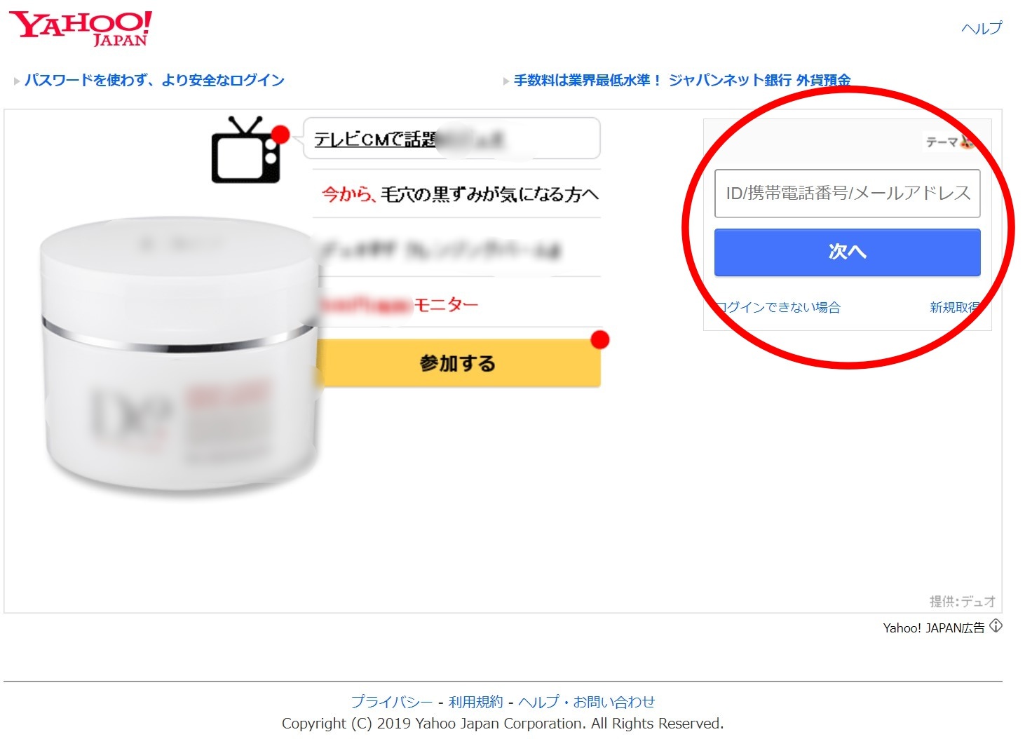 ログイン画面でYahoo!IDボタンをクリックします。するとこのような画面に移ります。左側の広告はログインに関係ないので、右側のIDにYahoo!のIDを入力して次へを押してください。