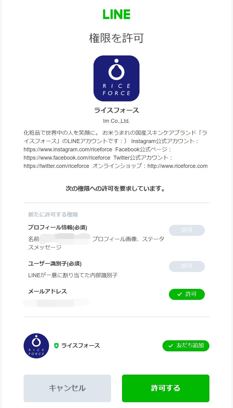 ライスフォースのLINEアカウントをあなたの友だちに追加しても良い場合はこのまま許可するをタップしてください。友だち追加したくないときは、友だち追加の項目をタップしてください。