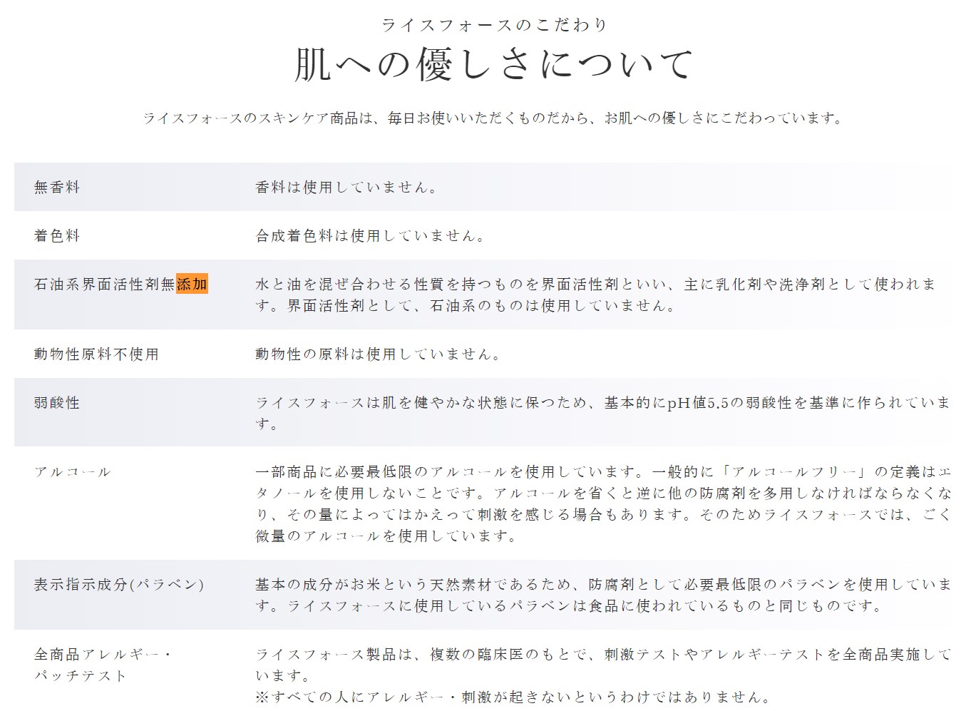 確かに合成界面活性剤の中には危険なものも含まれますが、そのほとんどが石油系の界面活性剤です。石油系界面活性剤を成分として一切使っていないライスフォースは安全性がかなり高いと思います! 何よりパッチテストやアレルギーチェックを複数の臨床医の元で入念にやっています。だからこそ、2008年の発売から2000万本も販売され、長くたくさんの方に愛用されているんですね!