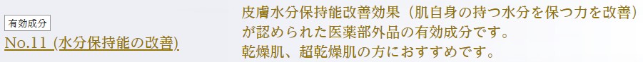 【有効成分】ライスパワーNo.11【その他成分】水、シクロペンタシロキサン、ジメチコン、濃グリセリン、エタノール、BG、DPG、POE・ジメチコン共重合体、オクタン酸セチル、オリブ油、植物性スクワラン、天然ビタミンE、POPメチルグルコシド、ポリオキシエチレンセスキステアリン酸メチルグルコシド、セスキステアリン酸メチルグルコシド、グリセリンモノステアリルエーテル、POE(7)ラウリルエーテル、軽質流動イソパラフィン、ヒアルロン酸Na-2、グリチルリチン酸2K、POEステアリルエーテル、カミツレ油-2、粘度調整剤、pH調整剤、EDTA-2Na、メチルパラベン